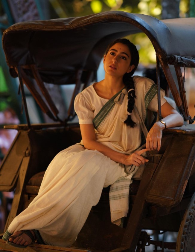 सारा अली खान फिल्म की अनाउंसमेंट से ही 'ऐ वतन मेरे वतन' को लेकर चर्चा में बनी हुई है। इसकी सबसे बड़ी हाइलाइट है फिल्म में उनका लुक। 'ऐ वतन मेरे वतन' के मोशन पोस्टर में भी एक्ट्रेस अलग अंदाज में नजर आ रही हैं। सफेद रंग की खादी साड़ी, माथे पर बिंदी लगाए, सारा अली खान का ये लुक ध्यान खींचने वाला है।