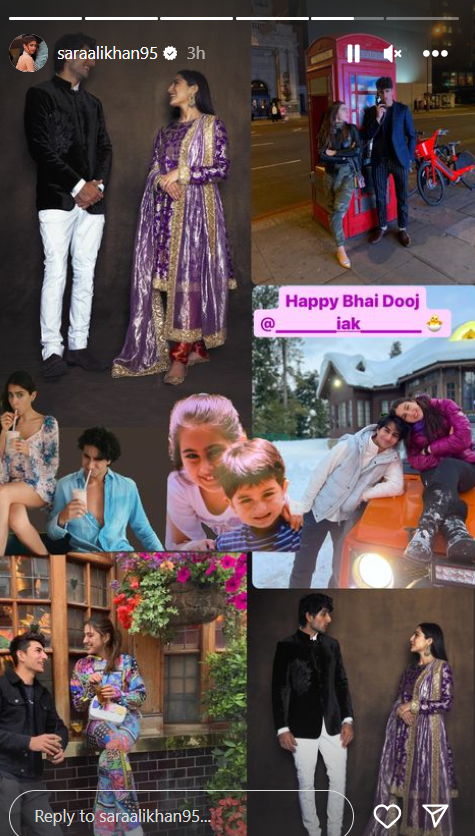 बॉलीवुड में कई सेलेब्स इस दिन को अपने भाई-बहन के साथ मना रहे हैं और सोशल मीडिया पर तस्वीरें भी साझा कर रहे हैं। अभिनेत्री सारा अली खान हर साल अपने भाई इब्राहिम अली खान के साथ भाई दूज का त्योहार मनाती है। इस बार भी कुछ ऐसा ही हुआ। एक्ट्रेस ने इसकी एक झलक अपने इंस्टाग्राम स्टोरी पर साझा की है। इस पोस्ट में सारा ने भाई इब्राहिम संग कई फोटोज का एक कोलाज साझा किया है और कैप्शन में लिखा, हैप्पी भाई दूज।