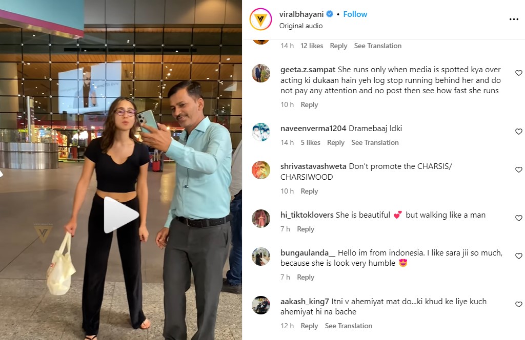 सारा अली खान के इस वीडियो को पैपराजी विरल भयानी ने अपने इंस्टाग्राम पेज पर शेयर किया है, जो थोड़ी देर में ही वायरल हो गया। इसके साथ ही सारा की ट्रोलिंग शुरू हो गई। वीडियो पर कमेंट करते हुए एक यूजर ने कहा, "ये तभी भागती है जब मीडिया आती है। ओवर एक्टिंग की दुकान है ये। इनके पीछे भागना बंद कर दो और कोई अटेंशन मत दो, कोई पोस्ट शेयर मत करो इनका फिर देखों कितनी तेज भागती है ये।" एक अन्य यूजर ने कमेंट किया, "ड्रामेबाज लड़की।"