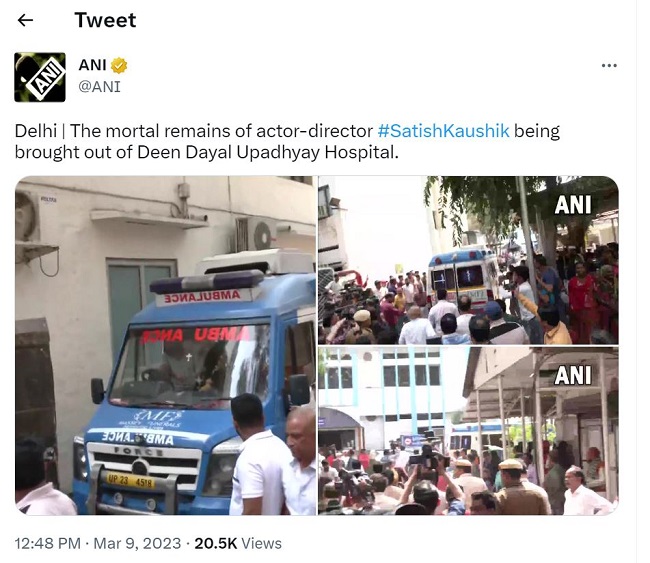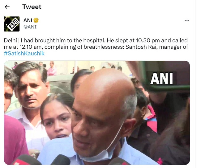 सतीश कौशिक के मैनेजर संतोष राय ने एएनआई को बताया, 'मैं उन्हें अस्पताल लेकर आया। वह रात को 10:30 बजे सोने गए थे। इसके बाद उन्होंने मुझे 12:10 पर कॉल किया। उन्होंने यह भी कहा कि उन्हें सांस लेने में समस्या हो रही है।' सतीश कौशिक के निधन से बॉलीवुड के अलावा उनके तमाम फैंस सदमे में है। कई लोगों ने उन्हें सोशल मीडिया पर श्रद्धांजलि भी दी है।