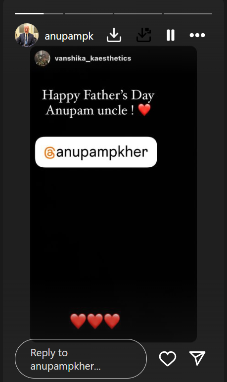 वंशिका ने शुक्रवार को इंस्टाग्राम स्टोरीज पर पोस्ट किया,"हैप्पी फादर्स डे अनुपम अंकल!" इसके बाद बच्चों के प्यारे खेर अंकल ने वंशिका की पोस्ट को अपनी स्टोरी में दिल वाले इमोजी के साथ दोबारा पोस्ट किया।