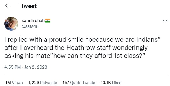 सतीश शाह ने हाल ही में अपने ट्विटर अकाउंट के जरिए अपने फैंस को ये जानकारी दी कि लंदन के हीथ्रो एयरपोर्ट पर एक स्टाफ मेंबर्स ने उन पर कमेंट किया। एक्टर ने ट्वीट करते हुए लिखा, 'मैंने जब हीथ्रो एयरपोर्ट के एक स्टाफ मेंबर को जब अपने साथी से पूछते हुए देखा कि, 'ये फर्स्ट क्लास का टिकट कैसे अफोर्ड कर सकते हैं, तो मैंने उन्हें गर्व से भरी हुई एक स्माइल देते हुए कहा, 'क्योंकि हम भारतीय हैं'। एक्टर के इस जवाब ने स्टाफ मेंबर की सिर्फ बोलती ही बंद नहीं की, बल्कि हीथ्रो एयरपोर्ट की तरफ से भी स्टाफ मेंबर की इस हरकत पर माफी मांगी गई। हीथ्रो एयरपोर्ट के ट्विटर अकाउंट पर माफी मांगते हुए लिखा गया, 'गुड मॉर्निंग, इस घटना के लिए हम आपसे माफी मांगते हैं। क्या आप हमें डीएम कर सकते हैं?