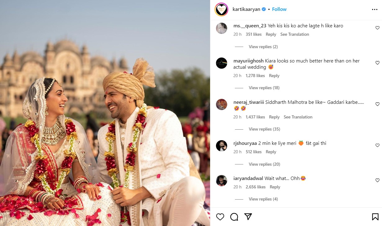 दरअसल, कार्तिक आर्यन और कियारा आडवाणी ने अपने ऑफिशियल इंस्टाग्राम अकाउंट पर सत्यप्रेम की कथा की एक फोटो शेयर की। तस्वीर में शादी का सीन दिख रहा है, लेकिन कार्तिक, कियारा और वेडिंग का बैकग्राउंड बिल्कुल किसी सेलिब्रिटी वेडिंग की तरह लग रहा है।