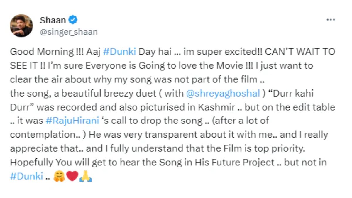 शाह रुख खान की फिल्म 'डंकी' की रिलीज के दिन शान ने अपने ऑफिशियल ट्विटर हैंडल पर एक लेटेस्ट ट्वीट किया है। इस ट्वीट में गायक शान ने लिखा है- ''आज फिल्म डंकी का दिन है। इसको लेकर मैं काफी ज्यादा एक्साइटेड हूं। इसको देखने के लिए अब मैं और इंतजार नहीं कर सकता हूं।