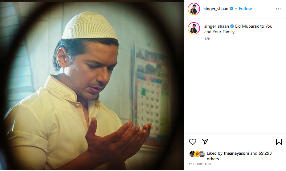 शान ने ईद के मौके पर अपने इंस्टाग्राम अकाउंट पर अपनी एक तस्वीर शेयर कर फैंस को इस खास दिन की बधाई दी। इस तस्वीर में वह सफेद कुर्ता पायजामा के साथ टोली लगाए हुए नजर आ रहे हैं। वहीं, इस दौरान व नमाज अदा करते दिख रहे हैं।