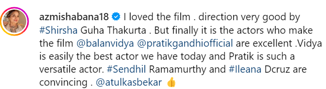 विद्या बालन, प्रतीक गांधी, इलियाना डिक्रूज और सेंथिल राममूर्ति स्टारर यह फिल्म कई बॉलीवुड सेलेब्स को भी काफी पसंद आई है। कुछ दिनों पहले तापसी पन्नू ने फिल्म का रिव्यू शेयर किया था और अब शबाना आजमी ने इस फिल्म की तारीफ की है।