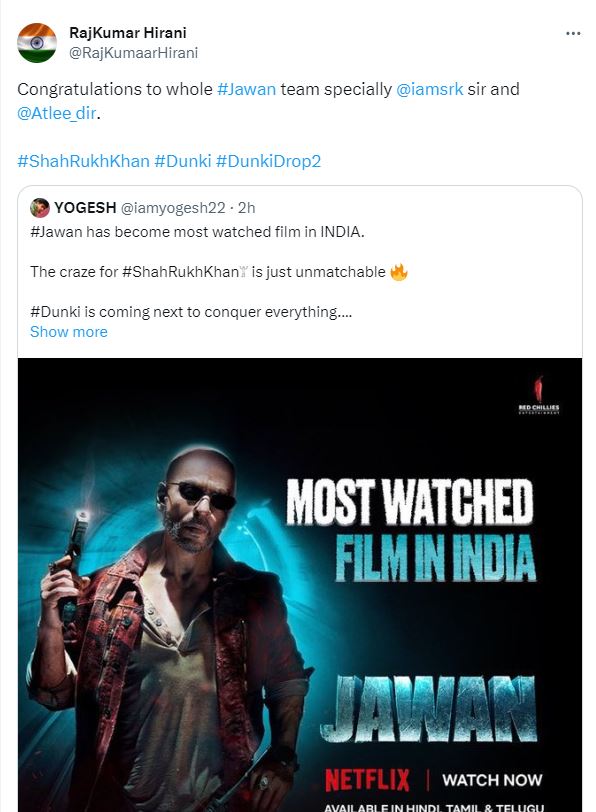 Jawan On Ott शाह रुख खान की फिल्म जवान ने सिनेमाघरों में तहलका मचा दिया था। ये हिंदी सिनेमा में इस साल की बॉक्स ऑफिस पर सबसे ज्यादा कमाई करने वाली मूवी है। थिएटर के बाद अब ओटीटी प्लेटफॉर्म नेटफ्लिक्स पर आने के बाद भी इस फिल्म का क्रेज कम नहीं हो रहा है। इस मूवी ने एक और बड़ा रिकॉर्ड बनाया जिस पर डंकी डायरेक्टर ने रिएक्ट किया।
