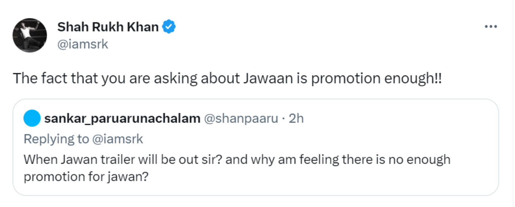 एक फैन ने लिखा- जवान का ट्रेलर कब आएगा सर? और मुझे ऐसा क्यों लग रहा है कि जवान का ज्यादा प्रमोशन नहीं किया जा रहा। इसके जवाब में शाह रुख ने लिखा- आप जवान के बारे में पूछ रहे, यह इस बात का प्रमाण है कि फिल्म का प्रमोशन हो रहा है।
