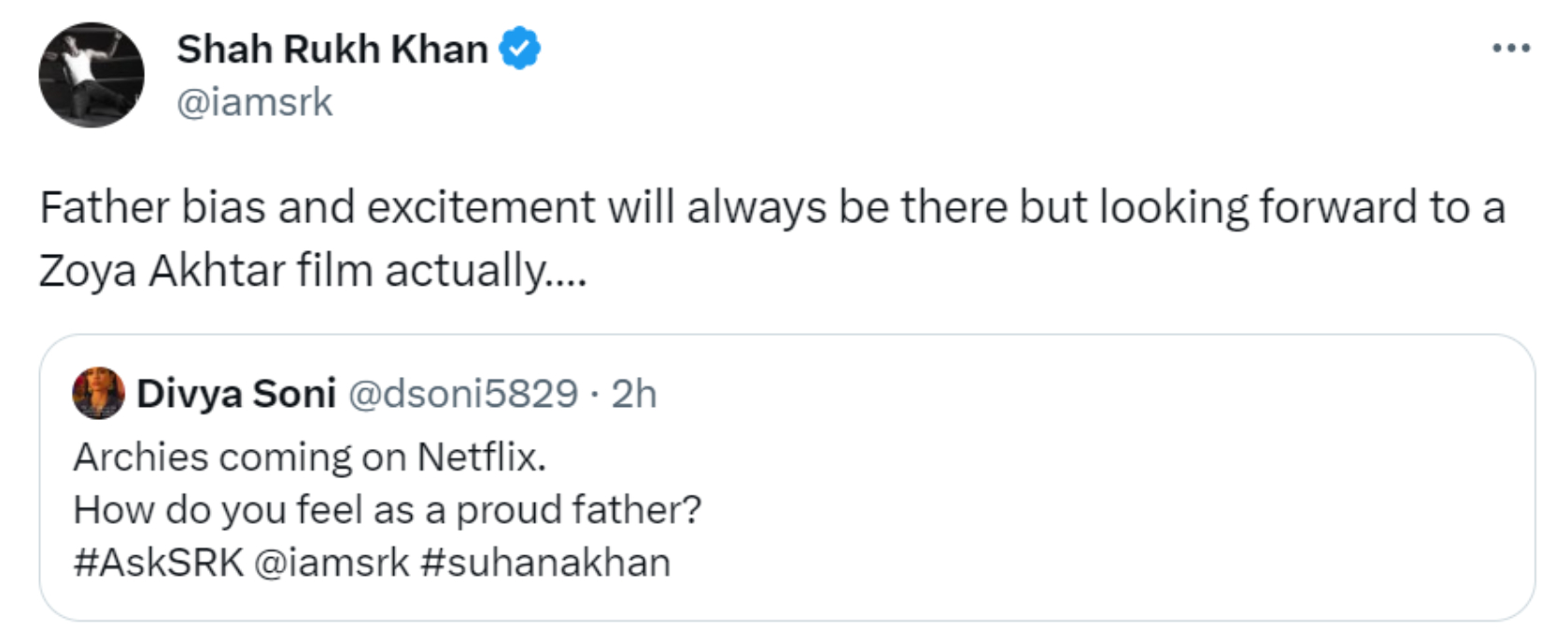 शाह रुख खान की बेटी सुहाना खान जोया अख्तर की फिल्म द आर्चीज से बॉलीवुड डेब्यू कर रही हैं। इसका नया पोस्टर सोमवार को नेटफ्लिक्स ने जारी किया। यूजर ने शाह रुख से जब इस बारे में पूछा कि एक पिता के तौर पर उन्हें कैसा महसूस होता है? इस पर उन्होंने लिखा- पिता के तौर पर झुकाव और उत्साह हमेशा रहेगा, लेकिन जोया अख्तर की फिल्म से काफी उम्मीदें हैं।