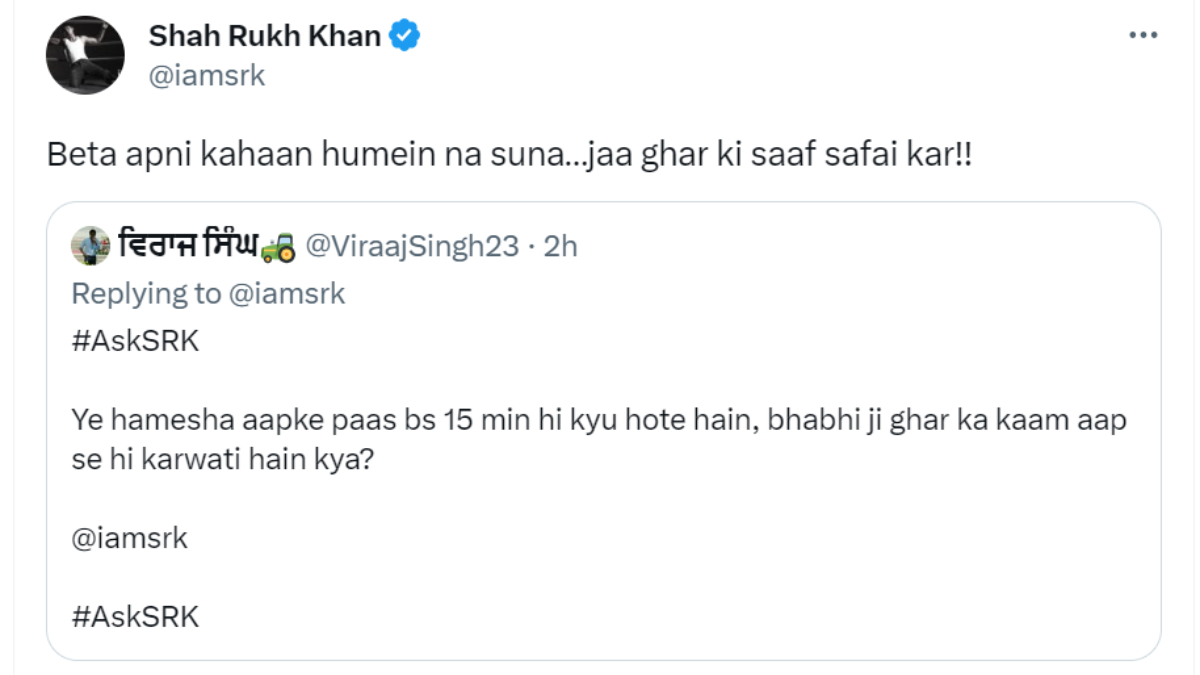 एक फैन ने किंग खान से पूछा- यह हमेशा आपके पास बस 15 मिनट ही क्यों होते हैं, भाभी जी घर का काम आप से ही करवाती हैं क्या? इस सवाल पर शाह रुख ने लिखा- बेटा, अपनी कहानी हमें ना सुना, जा घर की साफ-सफाई कर।