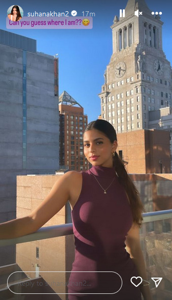 सुहाना खान ने अपनी इंस्टा स्टोरी पर एक लेटेस्ट तस्वीर शेयर की है। इस तस्वीर में सुहाना का स्टाइल देखते ही बन रहा है। फोटो में आप देख सकते हैं कि सहाना ने पर्पल कलर की बॉडी फिटेड ड्रेस कैरी की है। इस स्लीवलेस ड्रेस के साथ सुहाना ने गले में सिल्वर चेन पहनी है। वहीं, हेयर स्टाइल की बात करें तो उन्होंने एक पोनी बनाई है, जो उनपर काफी सूट कर रहा है। वहीं, आप देख सकते हैं कि इस तस्वीर का बैकग्राउंड काफी खूबसूरत नजर आ रहा है। इस फोटो को शेयर करने के साथ ही सुहाना ने पूछा है कि क्या आप बता सकते हैं मैं कहां हूं। फोटो में सुहाना की स्माइल उनके फैंस का दिल जीत रही है।