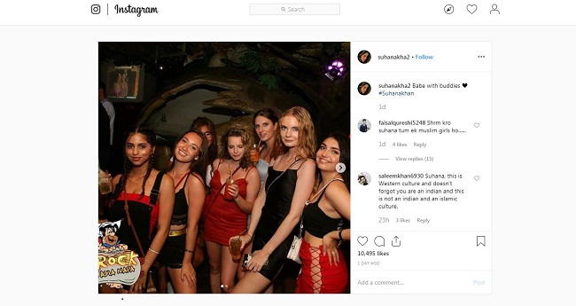 इन फोटो को शेयर करने के बाद सुहाना खान को सोशल मीडिया पर जमकर ट्रोल भी किया जा रहा हैंl एक ट्रोलर ने लिखा है,’शर्म करों सुहाना खान तुम एक मुस्लिम गर्ल होl’ वही एक दूसरे ट्रोलर ने लिखा है,’सुहाना यह पश्चिमी संस्कृति है और मत भूलों तुम एक भारतीय हों और यह न तो भारतीय कल्चर है और न तो इस्लामिक कल्चरl’