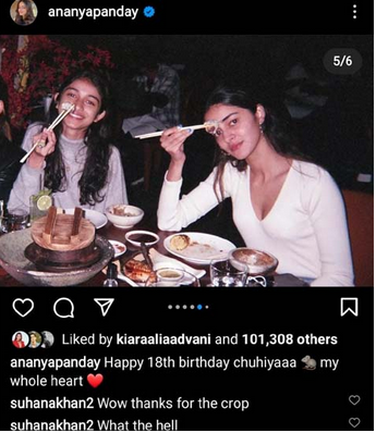 इस फोटो को इंस्टाग्राम अकाउंट पर शेयर करते हुए अनन्या पांडे ने कैप्शन में लिखा, 'हैप्पी बर्थडे चूहिया। मेरा दिल।' अनन्या के इस पोस्ट पर जहां हर कोई कमेंट कर रायसा को बर्थडे विश कर रहे हैं। वहीं इस पर कमेंट कर सुहाना ने लिखा, 'मुझे क्रॉप करने के लिए शुक्रिया। इसके बाद सुहाना ने एक और कमेंट करते हुए लिखा, 'what the hell...'। बात दें कि सुहाना खान का ये कमेंट सोशल मीडिया पर तेजी से वायरल हो रहा है।