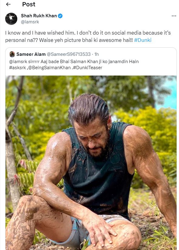हाल ही में किंग खान की 'डंकी' का नया गाना रिलीज हुआ है। इस सिलसिले में ही शाह रुख खान ने एक्स अकाउंट (Twitter) पर #ASKSRK सेशन किया। इस दौरान एक फैन ने सलमान खान की मिट्टी में सने हुए एक फोटो शेयर की। इस फोटो को शेयर करने के साथ ही फैन ने लिखा, "शाह रुख खान सर...आज बड़े भाई सलमान खान जी का जन्मदिन है"।