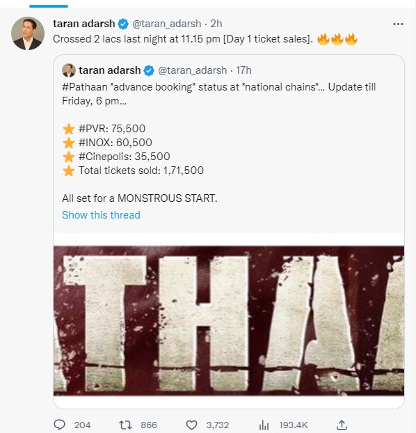 पठान की एडवांस बुकिंग का लोगों में जमकर क्रेज देखने को मिल रहा है। फिल्म क्रिटिक तरण आदर्श ने बताया कि शुक्रवार रात 11.15 बजे तक दो लाख टिकटें बिक गईं।
