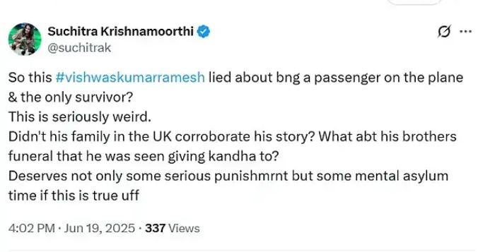 सुचित्रा कृष्णमूर्ति ने हाल ही में एक ट्वीट किया था जिसमें उन्होंने अहमदाबाद प्लेन क्रैश में सिर्फ एक शख्स के बच निकल जाने पर सवाल उठाया था। उन्होंने कहा था कि वह बचा हुआ शख्स वास्तव में कोई यात्री था ही नहीं। उन्होंने ट्वीट में लिखा, "तो इस विश्वास कुमार रमेश ने विमान में यात्री होने और एकमात्र जीवित बचे होने के बारे में झूठ बोला? यह वाकई अजीब है। क्या यू.के. में उसके परिवार ने उसकी कहानी की पुष्टि नहीं की? उसके भाई के अंतिम संस्कार के बारे में क्या, जिसमें उसे कंधा देते हुए देखा गया था? अगर यह सच है तो न सिर्फ उसे गंभीर सजा मिलनी चाहिए बल्कि वह पागलखाने भेजे जाने लायक है।"