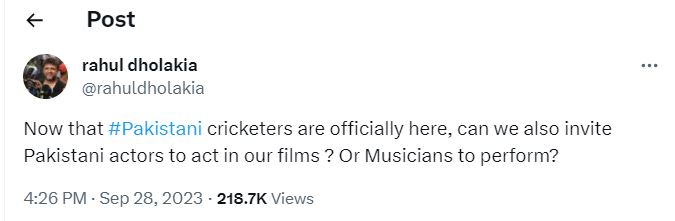 पाकिस्तानी क्रिकेट टीम से भारत में बैन हटने के बाद शाह रुख खान की फिल्म 'रईस' का निर्देशन करने वाले राहुल ढोलकिया ने एक्स (पूर्व ट्विटर) पर एक पोस्ट शेयर किया है। उन्होंने ट्वीट करते हुए लिखा,