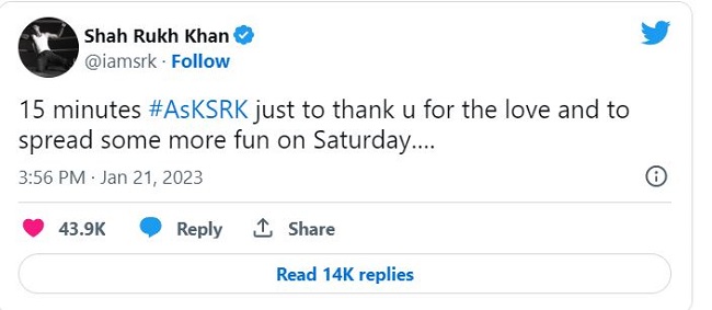 इसी बीच उनके एक फैन ने उनसे आस्क एसआरके सेशन में कहा, 'बुक माई शो क्रैश हो गया। शाह रुख खान क्या आप मुझे दो टिकट दे सकते हैं ताकि मैं पहले दिन का पहला शो देख सकूं?' इस पर शाह रुख खान ने प्रतिक्रिया देते हुए कहा है, 'नहीं टिकट तो आपको खरीदनी पड़ेगी। चाहे क्रैश हो या ना हो।' शाह रुख खान ने पिछले वर्ष कुछ फिल्मों में कैमियो किया था। वह रणबीर कपूर और आलिया भट्ट की फिल्म ब्रह्मास्त्र में भी नजर आए थे। इसके अलावा उन्होंने आर माधवन की रॉकेट्री: द नंबी इफेक्ट में भी छोटा सा कैमियो किया था। शाह रुख खान ने डार्लिंग जैसी फिल्मों का निर्माण भी किया है।