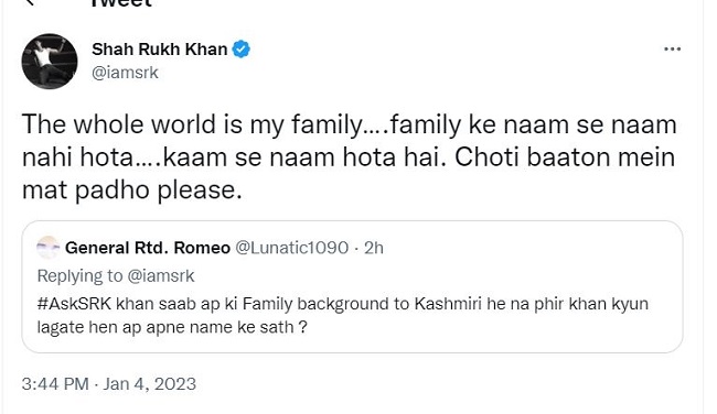 वहीं, शाह रुख खान से एक फैन ने पूछा है कि वह अपने नाम में खान क्यों लगाते हैं, जबकि उनका फैमिली बैकग्राउंड तो कश्मीरी है? इस पर शाह रुख खान ने लिखा है, 'मेरा पूरा विश्व परिवार है। किसी के नाम से नाम नहीं होता। काम से नाम होता है। छोटी बातों में मत पड़ो प्लीज।' शाह रुख खान ने नए वर्ष के अवसर पर फैंस से बातचीत की है।