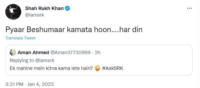 एक फैन ने शाह रुख खान से पूछा है कि उनकी महीने की कमाई कितनी है। इस पर भी शाह रुख खान ने उत्तर दिया है। एक फैन शाह रुख खान से पूछता है, 'एक महीने में कितना कमा लेते हो।' इस पर शाह रुख खान ने कहा है, 'प्यार बेशुमार कमाता हूं, हर दिन।' शाह रुख खान के फैंस को उनका उत्तर पसंद आया है। एक ने लिखा है, 'मुझे पसंद आया।'