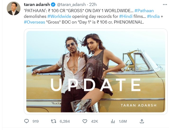 सिद्धार्थ आनंद द्वारा निर्देशित फिल्म पठान ने 100 करोड़ का आंकड़ा पार कर लिया है। फिल्म क्रिटिक तरण आदर्श ने बताया कि पठान फिल्म ने दुनियाभर में 106 करोड़ का बिजनस किया है।