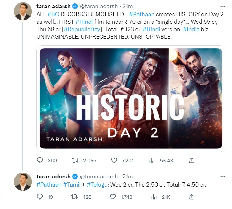 जबकि, पहले दिन अकेले घरेलू बॉक्स ऑफिस पर ही 'पठान' ने 50 करोड़ से ज्यादा की ओपनिंग की थी। इस लिहाज से यह हिंदी फिल्मों में सबसे बड़ी ओपनर फिल्म बनकर सामने आई है। तमिल और तेलुगू भाषा में फिल्म ने 4.50 करोड़ का बिजनेस किया। पहले दिन फिल्म का कुल कलेक्शन 55 करोड़ रहा। दूसरे दिन फिल्म ने 68 करोड़ का कलेक्शन किया।