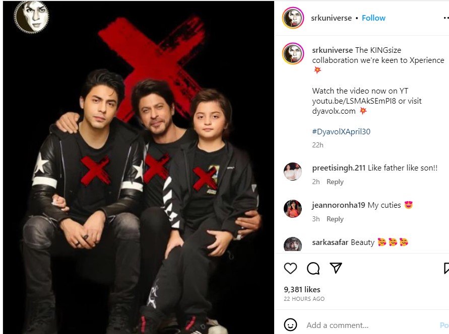 शाह रुख खान के फैन पेज की तरफ से एक फोटो शेयर की गई है, जिसमें उन्हें आर्यन और अबराम के साथ पोज देते देखा जा सकता है। तीनों ने इस फोटोशूट में एक ही कपड़े पहने हैं। आर्यन और अबराम के बीच शाह रुख खान को फ्रेम किया गया है, और तीनें ने ब्लैक जींस, टी शर्ट और हुडी पहनी है, जिस पर Dyavol.x का लोगो (एक्स) बना है। यह फोटोशूट आर्यन के लेटेस्ट क्लोदिंग ब्रांड के सिलसिले में किया गया है।