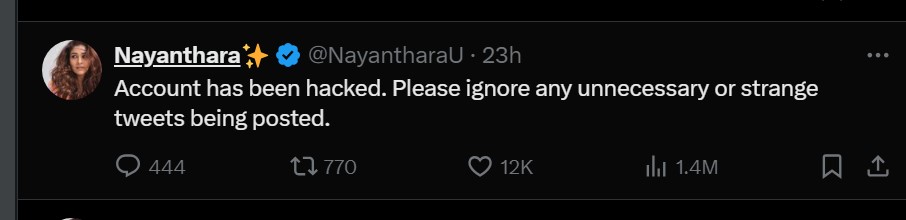 सुपरस्टार नयनतारा का अकाउंट हैक हो गया है। एक्ट्रेस ने शुक्रवार शाम को इस बात की जानकारी दी। उनका एक्स अकाउंट हैक किया गया है। ऐसे में 'जवान' एक्ट्रेस ने पोस्ट शेयर कर लिखा कि प्लीज पोस्ट किए जा रहे किसी भी गैरजरूरी या अजीब ट्वीट पर ध्यान न दें।