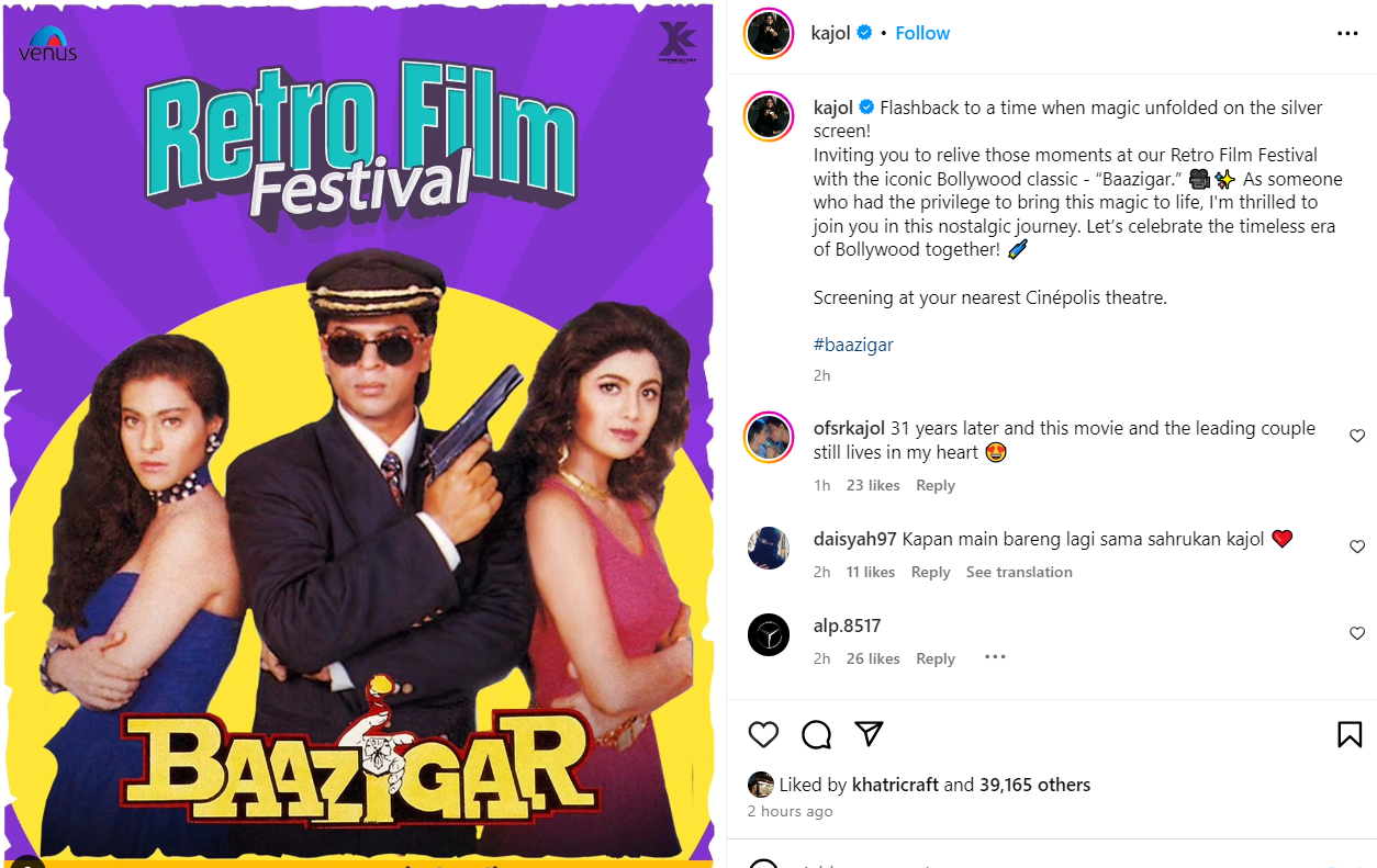 काजोल ने अपने इंस्टाग्राम पर फिल्म के पोस्टर को शेयर करते हुए कैप्शन में लिखा, फ्लैशबैक उस वक्त का, जब सिनेमा स्क्रीन पर जादू छाया था। आपको सिनेपोलिस के रेट्रो फिल्म फेस्टिवल में बॉलीवुड की इस क्लासिक फिल्म 'बाजीगर' के साथ उन यादों को फिर से जीने का मौका देती हूं। आपके नजदीकी सिनेपोलिस थिएटर में स्क्रीनिंग।