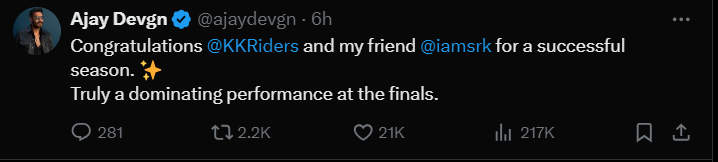 अजय देवगन ने एक्स पर लिखा," इस जीत पर और सीजन के सक्सेसफुल खत्म होने पर कोलकाता नाइट राइडर्स और मेरे दोस्त शाह रुख खान को बधाई। आपका फाइनल्स का परफॉर्मेंस बहुत ही अच्छा रहा।"