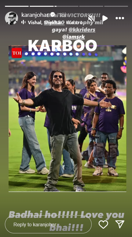 शाह रुख खान की बाहें फैलाते हुए उनके आइकोनिक पोज के साथ फोटो पोस्ट करते हुए फिल्ममेकर करण जौहर ने इंस्टाग्राम पर लिखा,“भाई की जीत! आईपीएल की ट्रॉफी मिल गई... बधाई हो। लव यू भाई!”