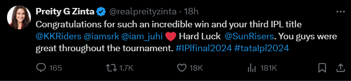 प्रीति जिंटा ने एक्स अकाउंट (पूर्व में ट्विटर) पर शाह रुख और जूही चावला को बधाई देते हुए लिखा, “इस अविश्वसनीय जीत और आपके तीसरे आईपीएल खिताब के लिए बधाई। सनराइजर्स के लिए प्रीति ने लिखा कि आप लोग पूरे टूर्नामेंट में बहुत अच्छे रहे, बस किस्मत ने साथ नहीं दिया।”
