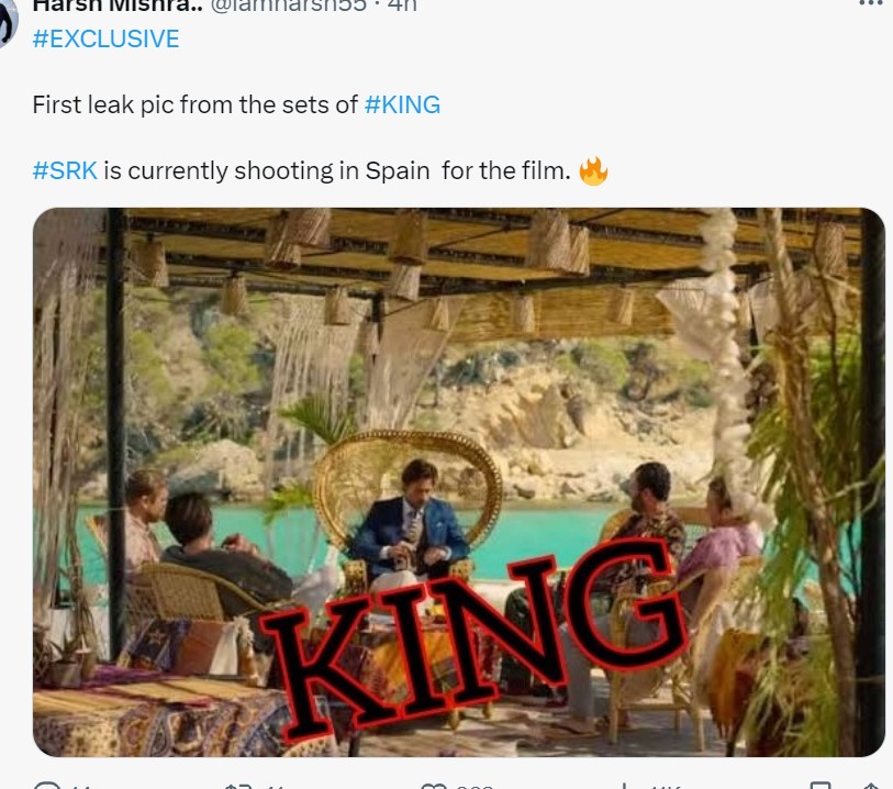 सोशल मीडिया प्लेटफॉर्म पर शाह रुख की जो फोटो सामने आई है, उसमें वह कुछ लोगों के साथ नजर आ रहे हैं। किंग खान ब्लू कलर के सूट पैंट पहने नजर आ रहे हैं। उन्होंने हाथ में कुछ पकड़ रखा है। चेहरे के भाव ऐसे लग रहे हैं, जैसे वह किसी गंभीर स्थिति में कुछ बात कर रहे हों। इस फोटो के सामने आने के बाद यूजर्स ने कयास लगाए हैं कि किंग खान 'किंग' की शूटिंग स्पेन में कर रहे हैं।