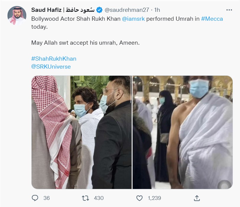 शाह रुख खान के उमराह की बात सऊदी अरब के एक पत्रकार ने कंफर्म की है। एक्टर के उमराह की तस्वीरें शेयर करते हुए पत्रकार ने जानकारी दी कि एक्टर ने गुरुवार को मक्का में उमराह किया। तस्वीरों में शाह रुख सफेद रंग के लिबास में नजर आ रहा हैं, जो उनके फैंस के लिए भी नया है क्योंकि शाह रुख बिल्कुल अलग लुक में दिख रहे हैं।