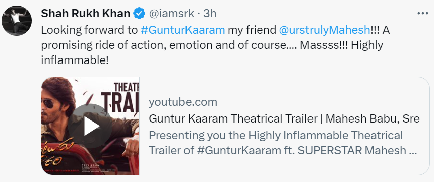 शाह रुख खान ने आज 13 जनवरी को अपने सोशल मीडिया हैंडल एक्स पर एक ट्वीट किया और लिखा 'गुंटूर कारम का इंतजार कर रहा हूं मेरे दोस्त महेश बाबू। एक्शन, इमोशन और निश्चित रूप से एक आशाजनक सवारी, मास्स। अत्यधिक ज्वलनशील'। किंग खान ने ट्वीट के साथ फिल्म का ट्रेलर भी शेयर किया है।