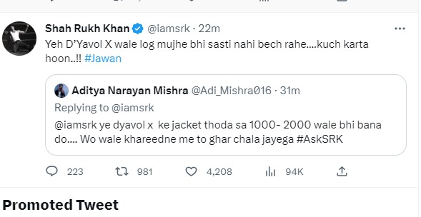 ट्विटर पर आदित्य नारायण मिश्रा नाम के यूजर ने किंग खान से कहा, ''ये D'Yavol X के जैकेट थोड़ा सा 1000-2000 वाले भी बना दो...वो वाले खरीदने में तो घर चला जाएगा।''