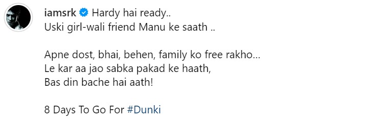 ''हार्डी है रेडी, उसक गर्ल वाली फ्रेंड मन्नू के साथ, अपने दोस्त, भाई, बहन, फैमिलो को फ्री रखो, लेकर आ जाओ सबका पकड़ के हाथ, बस दिन बचे हैं 8।'' इस तरह से शाह रुख खान ने अपनी अपकमिंग मूवी के पोस्टर के साथ ये दिल जीतने वाला कैप्शन लिखा है। फैंस डंकी के इस लेटेस्ट पोस्टर को काफी पसंद कर रहे हैं।