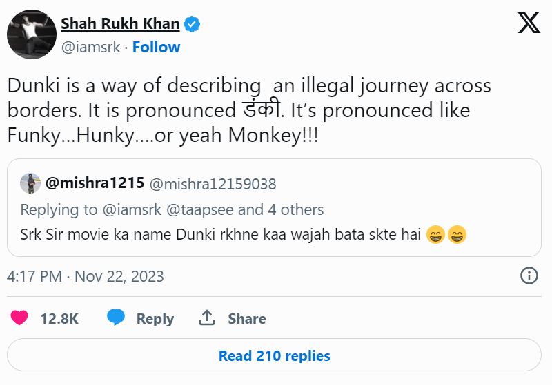 इस बीच ही #ASKSRK सेशन के दौरान एक फैन ने शाह रुख खान को ट्वीट करते हुए लिखा, "SRK सर मूवी का नाम डंकी रखने की वजह बता सकते हैं?" अपने फैंस को बिना निराश किये शाह रुख खान ने जवाब देते हुए लिखा, "डंकी बॉर्डर के पार एक गलत तरीके से सफर तय करने का एक तरीका है, जिसे 'डंकी' कहा जाता है। जैसे फंकी- हंकी और मंकी होता है, वैसे ही है"।