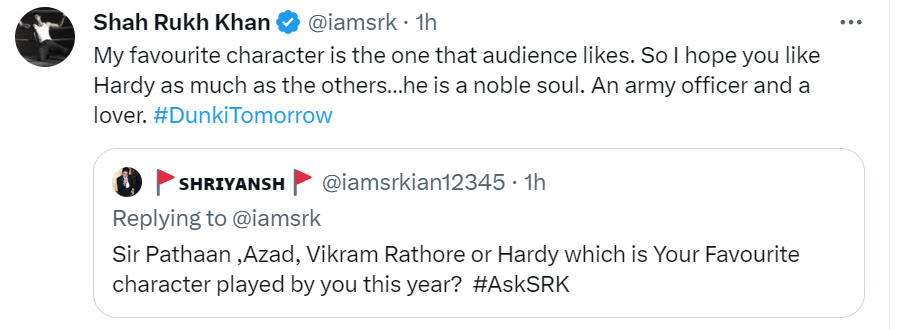 ''मेरा फेवरेट रोल वही है जो दर्शकों को आसानी से पसंद आए। इसलिए मुझे इस बात की पूरी उम्मीद है कि हार्डी भी अन्य दूसरे किरदारों की तरह आपको पसंद आएगा। वह एक नेक किरदार है, जो एक आर्मी ऑफिसर और एक प्रेमी है।'' इस तरह से अपने ही स्टाइल में शाह रुख ने फैन के सवाल का गोल-मोल जवाब दिया है। हालांकि इससे ये अंदाजा लगाया जा सकता है कि 'डंकी' के हार्डी का रोल उनके दिल के काफी करीब है।