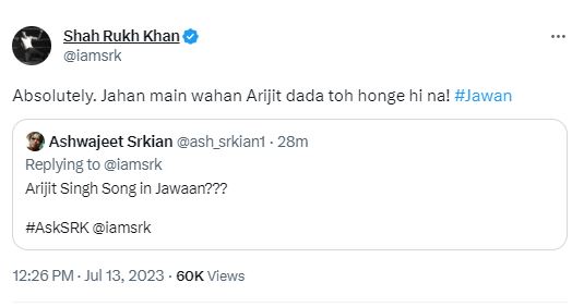 इस सवाल जवाब के दौरान एक फैन ने शाह रुख खान से पूछा कि क्या उनकी फिल्म जवान में अरिजीत सिंह का गाना होगा? शाह रुख खान ने भी बड़े ही प्यार से फैंस के सवाल का जवाब देते हुए कहा, "बेशक होगा, जहां मैं वहां अरिजीत दादा तो होंगे ही ना"।