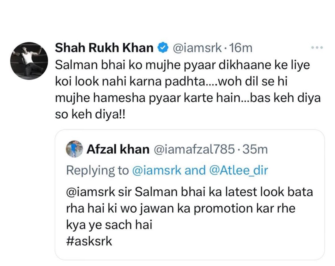इस बीच शाह रुख खान के ट्विटर पर आस्क एसआरके सेशन के दौरान एक फैन ने उनसे से सवाल किया है और लिखा है कि- ''सलमान खान का लेटेस्ट लुक बता रहा है कि वो जवान को प्रमोट कर रहे हैं, क्या ये बात सच है।'' इस सवाल का शाह रुख खान ने फौरन जवाब देते हुए लिखा है कि-