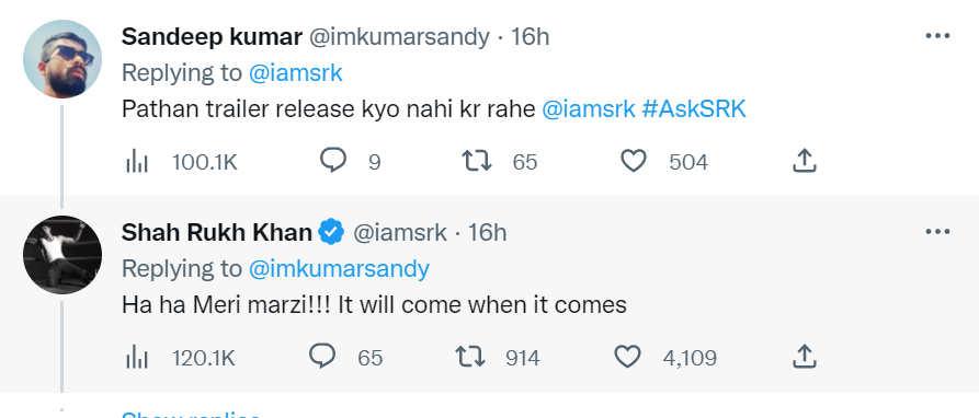 दरअसल, इस सेशन के दौरान शाह रुख के एक फैंस उनसे पूछा की फिल्म 'पठान' का ट्रेलर आखिर क्यों रिलीज नहीं कर रहे? एक्टर अपने अंदाज में इसका जवाब दिया और लिखा- हाहा... मेरी मर्जी... वो तभी आएगा जब उसे आना होगा। वहीं दूसरे यूजर ने शाहरुख खान के 8 पैक्स वाले लुक का फोटो शेयर करते हुए पूछा- 'सर कितना टाइम लगा आपको?' एक्टर ने जवाब दिया, '57 साल भाई। वहीं आखिर में एक्टर ने लिखा- अब मुझे जाना होगा...अबराम मुझे बुला रहा है. थैंक यू सभी को. सभी को नए साल और क्रिसमस की बहुत मुबारकबाद. दुआ है कि आगे आपकी जिंदगी के सबसे बेहतरीन दिन आपको जीने को मिलें।