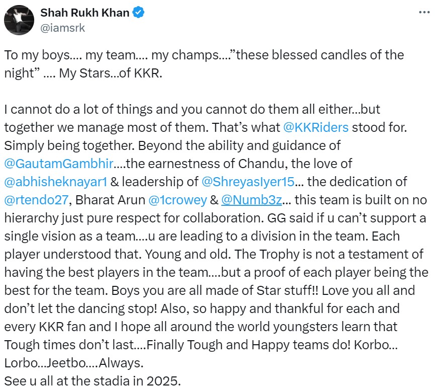 शाह रुख खान ने अपने सोशल मीडिया हैंडल एक्स पर कोलकाता नाइट राइडर्स की जीत पर पोस्ट करते हुए लिखा कि मेरे लड़के, मेरी टीम, मेरे चैंप्स। मैं बहुत सारे काम नहीं कर सकता और आप सब भी नहीं कर सकते, लेकिन हम सब मिलकर उनमें से ज्यादातर को मैनेज कर सकते हैं। यही केकेआर का उद्देश्य भी है। बस साथ रहना।