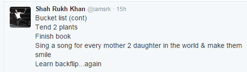 शाहरुख ने एक ट्वीट में लिखा, 'सिर्फ इसे यहां रख रहा हूं...मेरे बचे काम की लिस्ट। जैसा कि मैंने कहा था बढ़ भी रही है और बदल भी रही है, मगर अभी ये ऐसी है।' शाहरुख की एक लिस्ट ये रही।