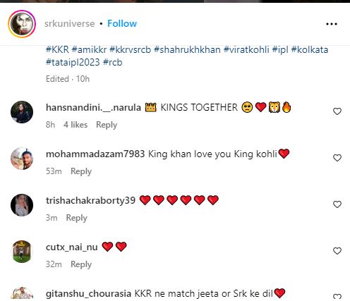 दोनों को साथ देखकर फैंस खुशी से झूम उठे हैं। एक यूजर ने कमेंट करते हुए लिखा, 'दो किंग एक साथ'। दूसरे यूजर ने लिखा, 'केकेआर ने मैच जीता और शाह रुख खान ने दिल जीत लिया'। अन्य यूजर ने लिखा, 'किंग खान और किंग कोहली'।