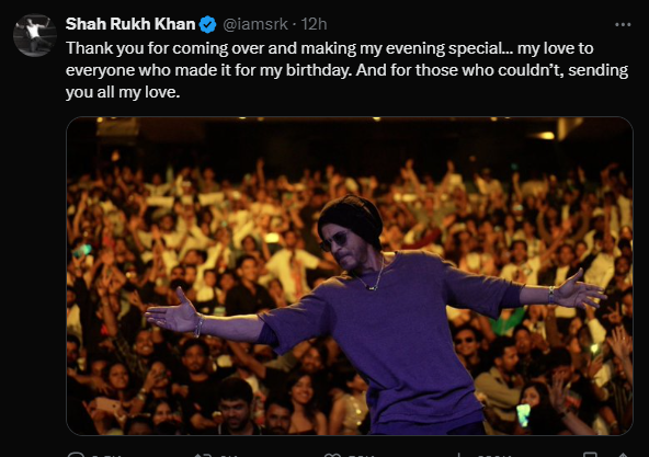 कई सालों के बाद उन्हें बालकनी में न देखकर फैंस निराश न हो, इसके लिए भी शाह रुख खान ने तोड़ निकाल लिया। पठान एक्टर ने अपने आधिकारिक एक्स अकाउंट पर एक फोटो शेयर की, जिसमें वह अपना सिग्नेचर स्टेप कर रहे हैं और उनके पीछे हजारों की भीड़ है। हालांकि, ये भीड़ मन्नत के बाहर खड़े फैंस की नहीं, बल्कि मुंबई के बांद्रा के एक फैन क्लब की है, जिसको अटेंड करने शाह रुख खान पहुंचे थे।