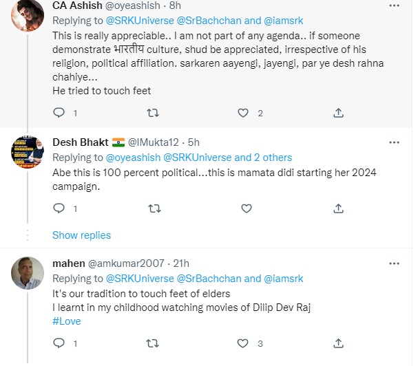 इस समारोह के कई वीडियो सामने आए हैं। सबसे ज्यादा यह वीडिया वायरल हो रहा है, जिसमें शाह रुख ने बिग बी और जया बच्चन के पैर छुए। किंग खान का यह विनम्र स्वभाव सभी का दिल छू रहा है। यूजर्स ने उनके इस कदम को काबिलेतारीफ बताया है। एक ट्विटर यूजर ने कहा, 'यह तारीफ के लायक है..मैं किसी एजेंडा का हिस्सा नहीं..अगर कोई भारतीय कल्चर को दिखा रहा है, तो उसकी सराहना होनी चाहिए, उसके मजहब, पॉलिटिकल कनेक्शन को देखे बिना। सरकारें आएंगी, जाएंगी, पर यह देश रहना चाहिए। उसने पैर छूने की कोशिश की।'