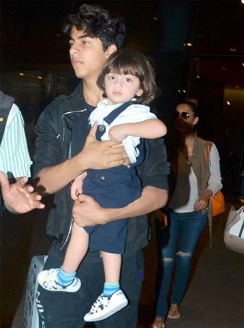 लंदन से वापसी पर शाहरुख खान के बड़े बेटे आर्यन अपने छोटे भाई अबराम को गोद में लिए एयरपोर्ट से निकलते दिखे और उन्हें कार में बैठाते हुए भी नजर आए।