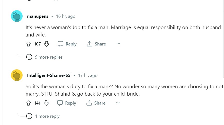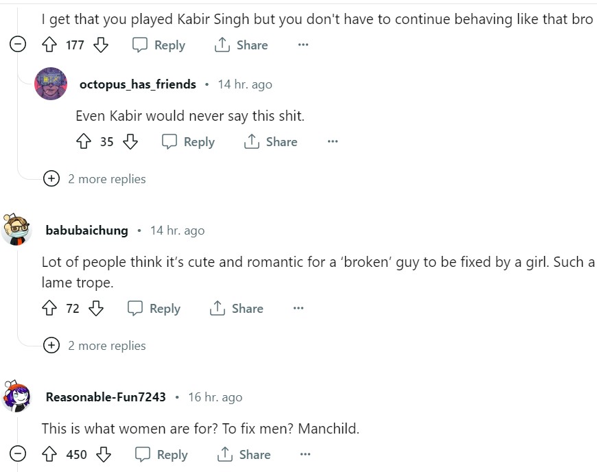 एक अन्य यूजर ने कहा, "उसने कबीर सिंह का रोल प्ले किया था, क्योंकि वो ऐसा ही था।" औरतों का पक्ष रखते हुए एक यूजर ने कहा, "अच्छा तो औरतों इसलिए होती हैं ? मर्दों को ठीक करने के लिए ? बच्चों जैसी बातें।" वहीं, एक यूजर ने कहा, "ये औरतों का काम नहीं है कि आदमियों को ठीक करें। शादी पति और पत्नी दोनों की बराबर की जिम्मेदारी होती है।"