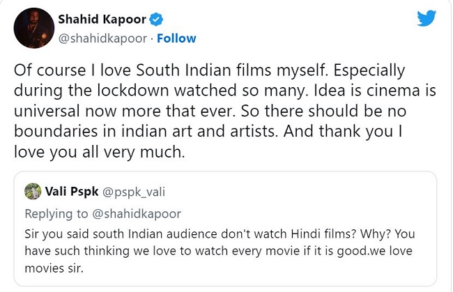 इसके पहले शाहिद कपूर ने दक्षिण के दर्शकों से निवेदन किया था कि वह हिंदी फिल्में देखें। उन्होंने एक वक्तव्य में कहा था,